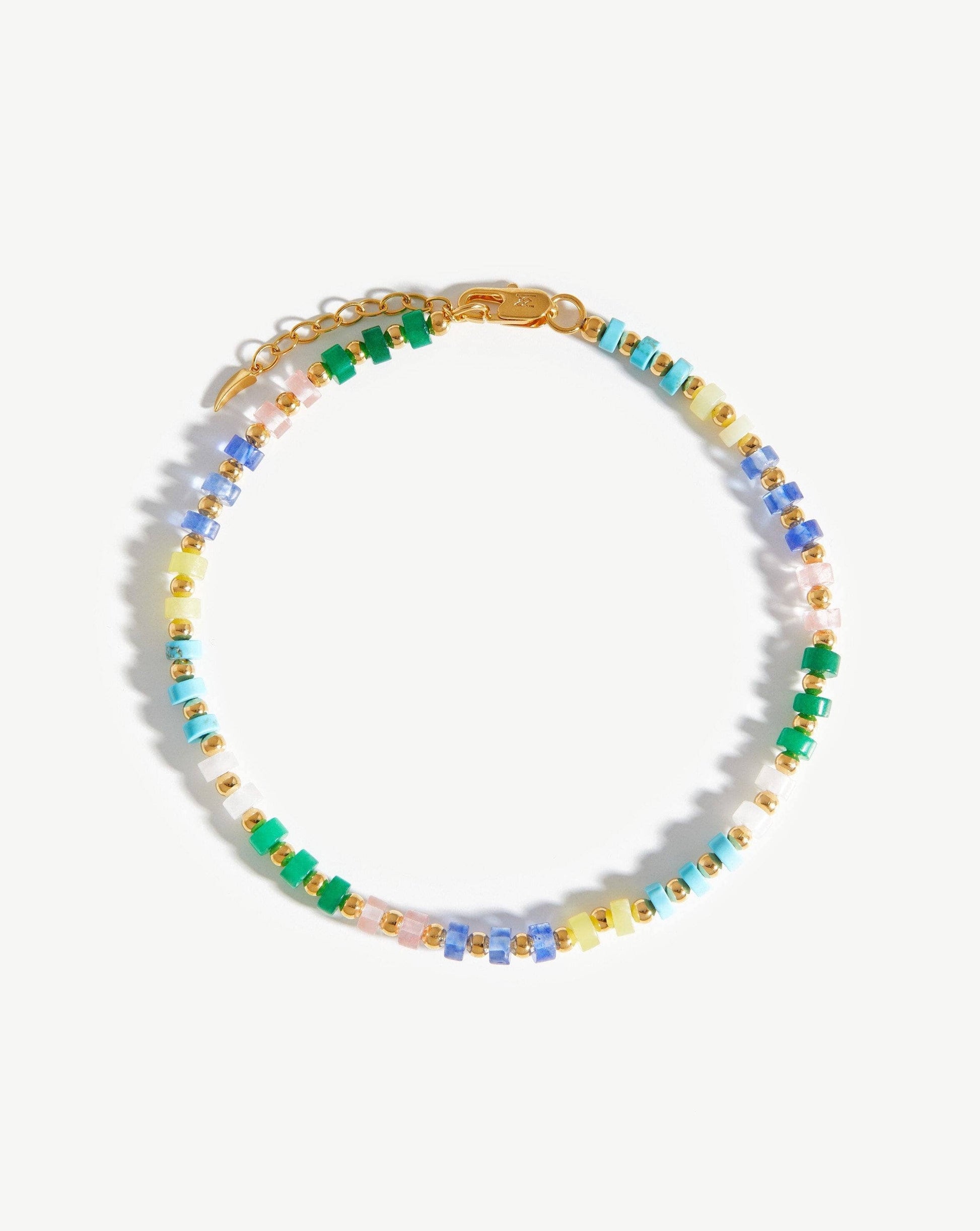 A kaleidoscope of colour to express yourself with. This distinctive anklet features mix of stones including white serpentine, turquoise, yellow jade, reconstructed imperial jasper and green jade. Team with your bare legs for a standout summer look.