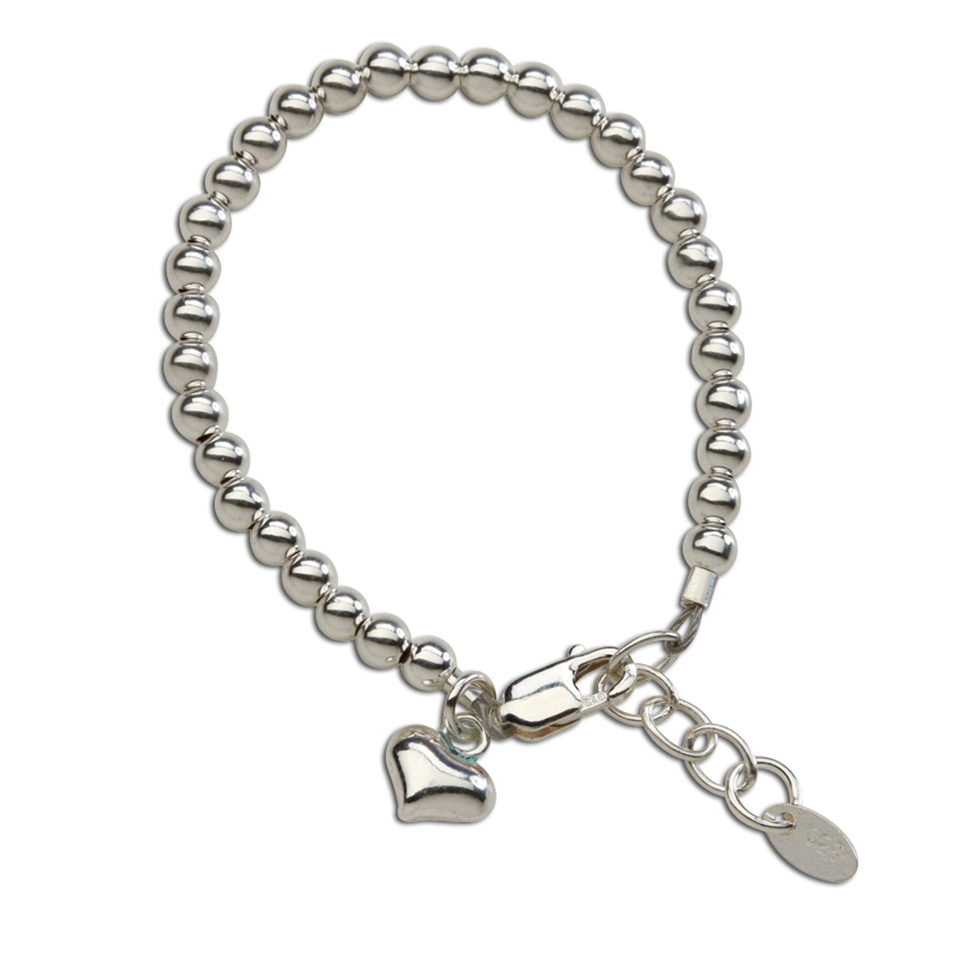 This keepsake bracelet is made with a strand of sterling silver beads accented with a beautiful dainty sterling silver puff heart charm! A gorgeous classic she will cherish forever! Each bracelet has an extension chain, so as the child grows you just move to the next link for a perfect fit. This bracelet is available in three sizes and is great for infants, babies, toddlers, kids on up to tweens. This bracelet comes in a beautiful gift box. Hand made in the USA!