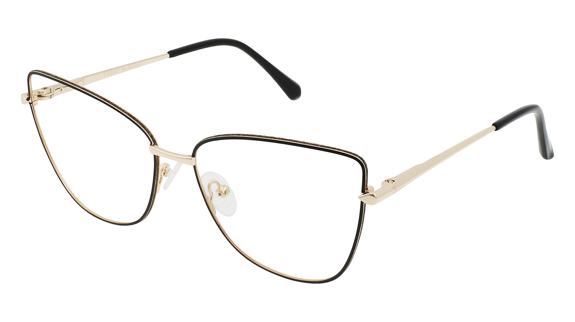 - Ghazaleh features a cat eye shaped frame in a gold and black colorway.?