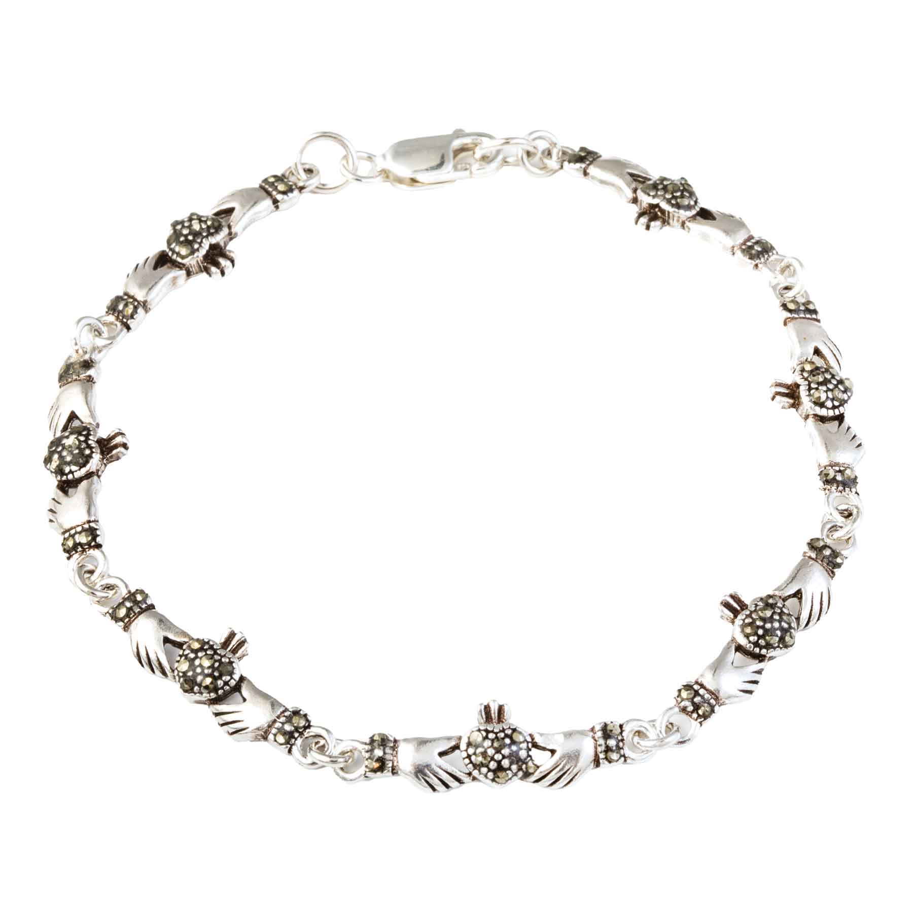 Embrace the essence of Irish tradition with our Sterling Silver Irish Claddagh Bracelet. Expertly crafted from sterling silver for lasting durability and a high shine, this bracelet is beautifully accented with marcasite, adding an extra layer of sophistication. The bracelet features the iconic Claddagh Ring design, a poignant symbol of love, friendship, and loyalty that tells the story of an Irish seafarer's tribute to his lost love. With a secure clasp closure, the bracelet measures 0.75” by 0.23”, ensuring a comfortable fit for daily wear. Presented in an elegant box, it makes a unique and meaningful gift that captures the heart of Irish culture.