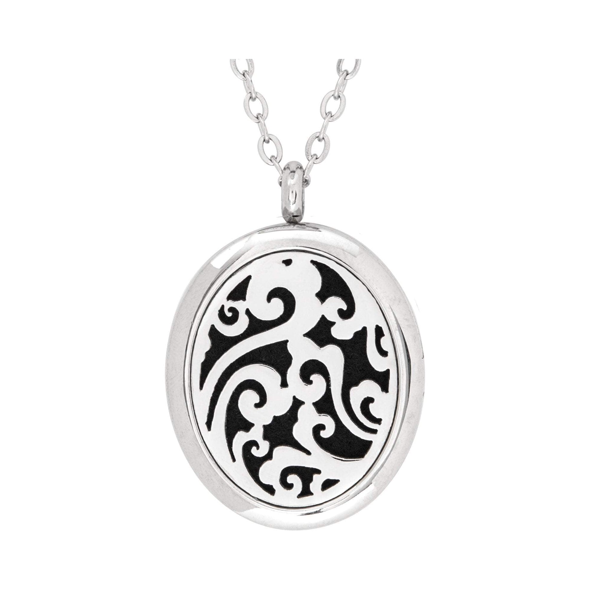 Enhance your retail clients’ overall well-being with the Serina and Company Stainless Steel Whimsical Oval Pendant. When an essential oil is applied to the wool pad inside, scent is diffused through vents in the locket, allowing clients to enjoy aromatherapeutic benefits any time and place. This beautifully constructed, high quality locket and chain are both made of surgical stainless steel. Chain is 18"L
