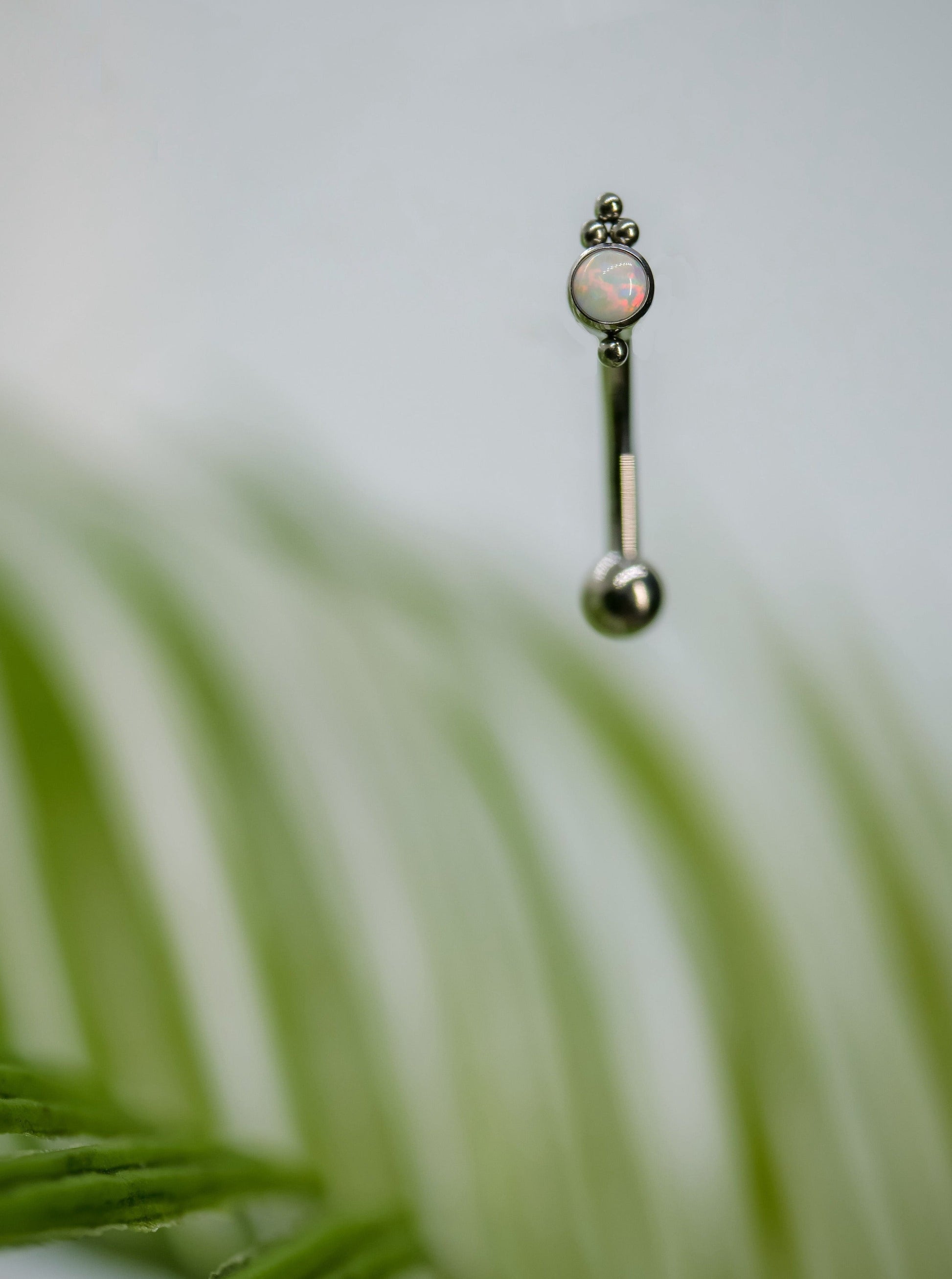A beautiful white opal topped with a titanium 3 bead cluster sits atop a 16g curved barbell of implant grade titanium,.